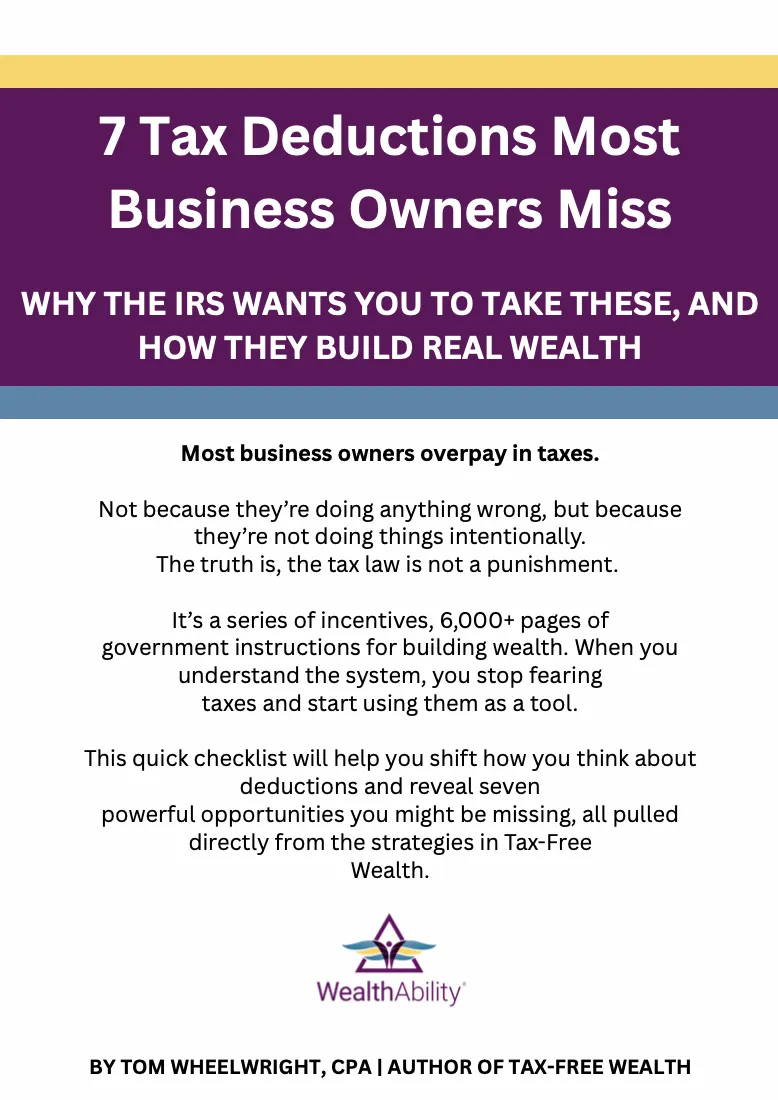 Tom Wheelwright’s results, strategies, and experiences are not typical and are not a guarantee of your financial success. WealthAbility® does not promise or imply any guaranteed outcomes, whether in tax savings, wealth building, or business growth, based on the use of our education, systems, or services. Individual results will vary widely depending on factors including personal effort, financial situation, business model, and market conditions. All content presented on this website, including but not limited to tax strategies, videos, frameworks, and written material, is the intellectual property of WealthAbility®, LLC. Unauthorized use, reproduction, or distribution of any material without express written consent is strictly prohibited.